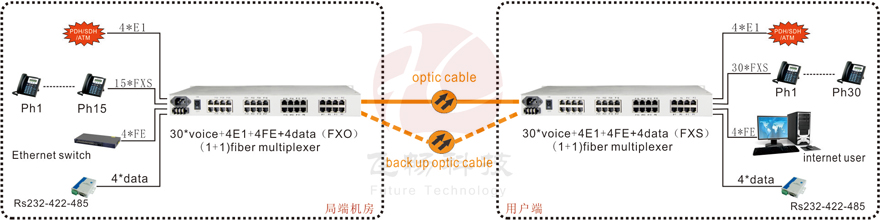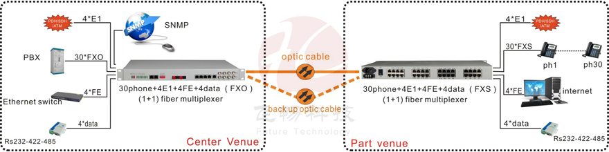 This device provides 30Channel telephone 1-4Channel E1 interface, 4Channel 10M/100M Ethernet interface (Line Speed 100M) and 4 expansion interface. 4Channel Ethernet interface is switch interface, can support VLAN. 4 expansion interface can be used as the transmission channel of RS232/RS485/RS422 asynchronous data, voice signal, 2/4 line E&M audio signal, switch signal, Ethernet signal (Bandwidth 2M). It is very flexible.