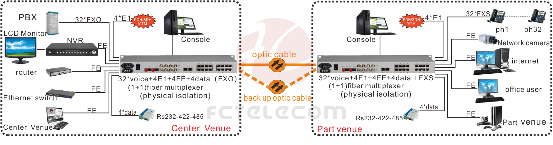 The equipment provides 32*Voice, 1 ~ 4 E1 interface, 4 physical isolation 100M Ethernet interface (100M per wire speed independent bandwidth), and four extended service interfaces. 4 expansion service interface can be used as RS232/RS485/RS422 asynchronous data/TTL signal/dry contact signal and other transmission channels, the application is very flexible.