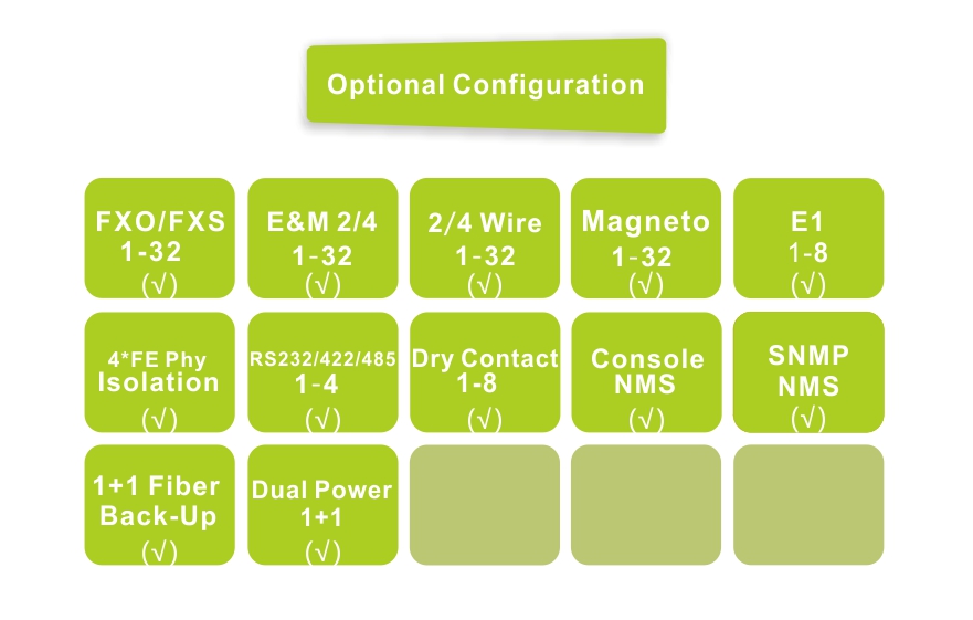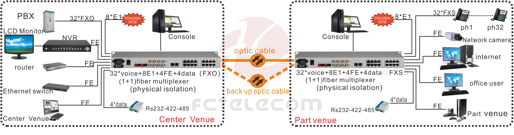 The equipment provides 32*Voice 1 ~ 4 E1 interface 4 physical isolation 100M Ethernet interface (100M per wire speed independent bandwidth) and four extended service interfaces. 4 expansion service interface can be used as RS232/RS485/RS422 asynchronous data/TTL signal/dry contact signal and other transmission channels the application is very flexible.