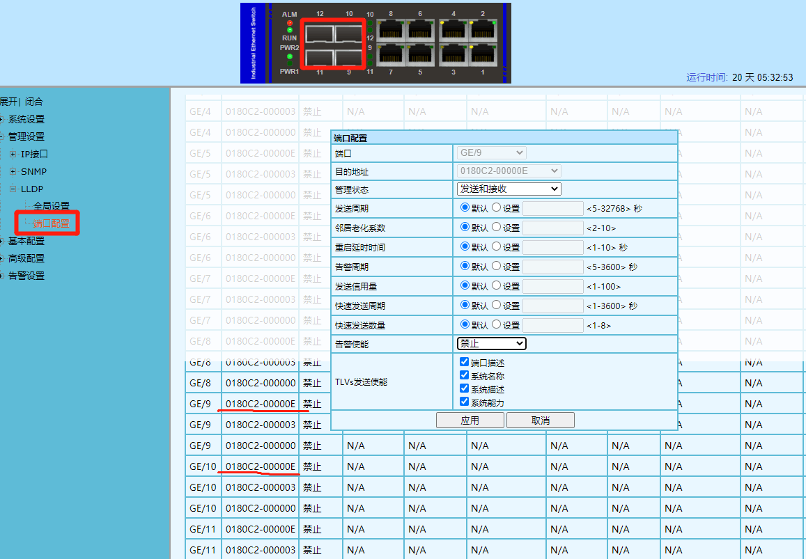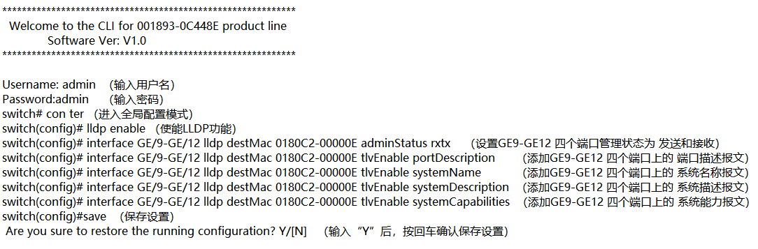 switch(config)# interface GE/9-GE/12 lldp destMac 0180C2-00000E adminStatus rxtx    (設置GE9-GE12 四個端口管理狀態(tài)為 發(fā)送和接收)