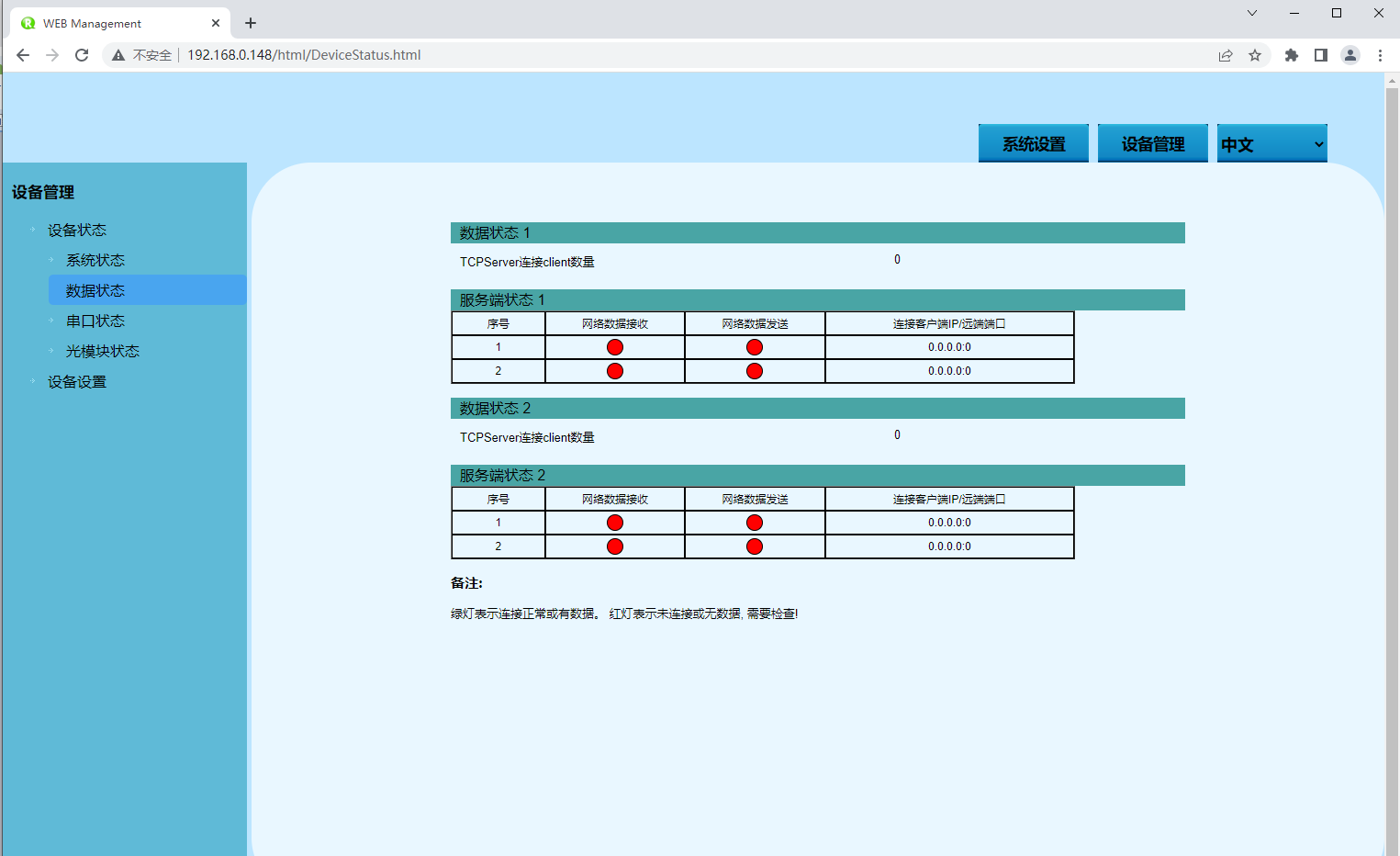 在“設備狀態(tài)”頁面,可以查看串口網(wǎng)絡數(shù)據(jù)收發(fā)信息。