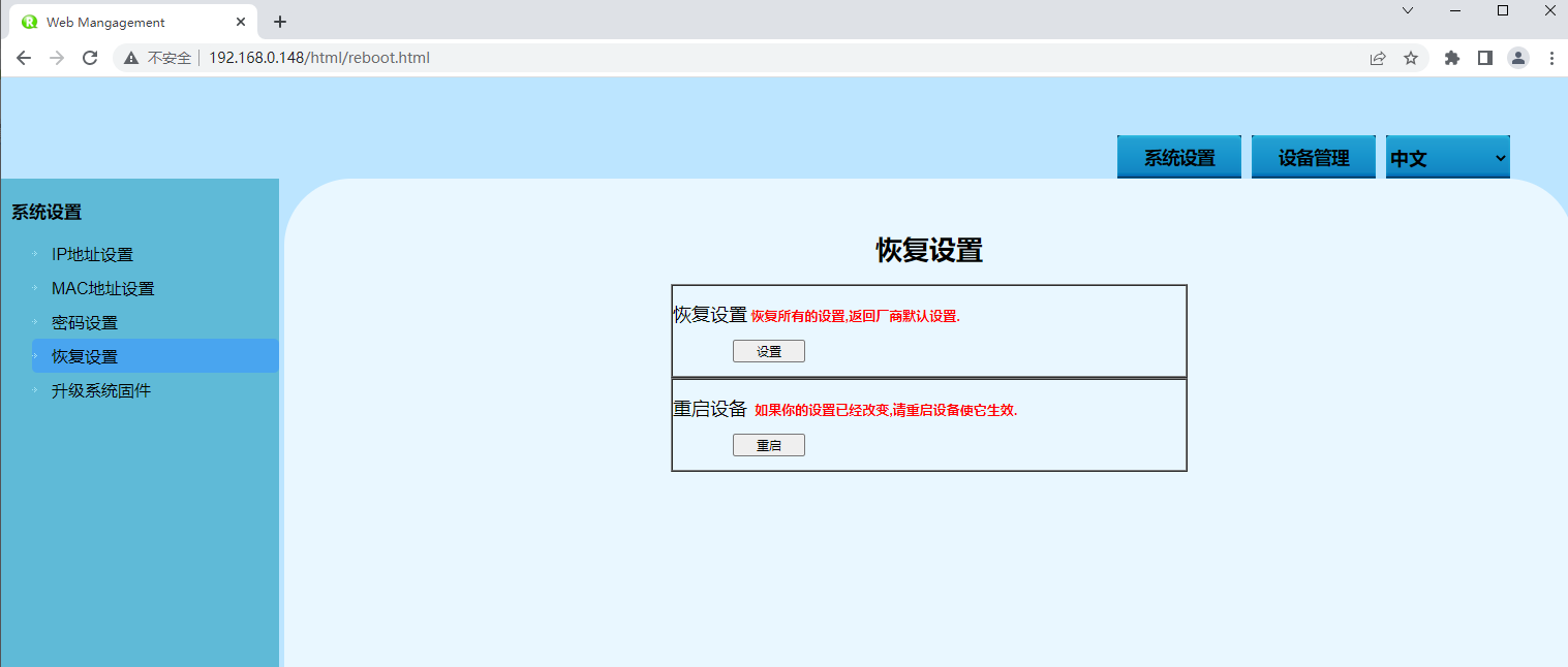在“恢復出廠設置”頁面,可以使設備恢復到出廠配置。