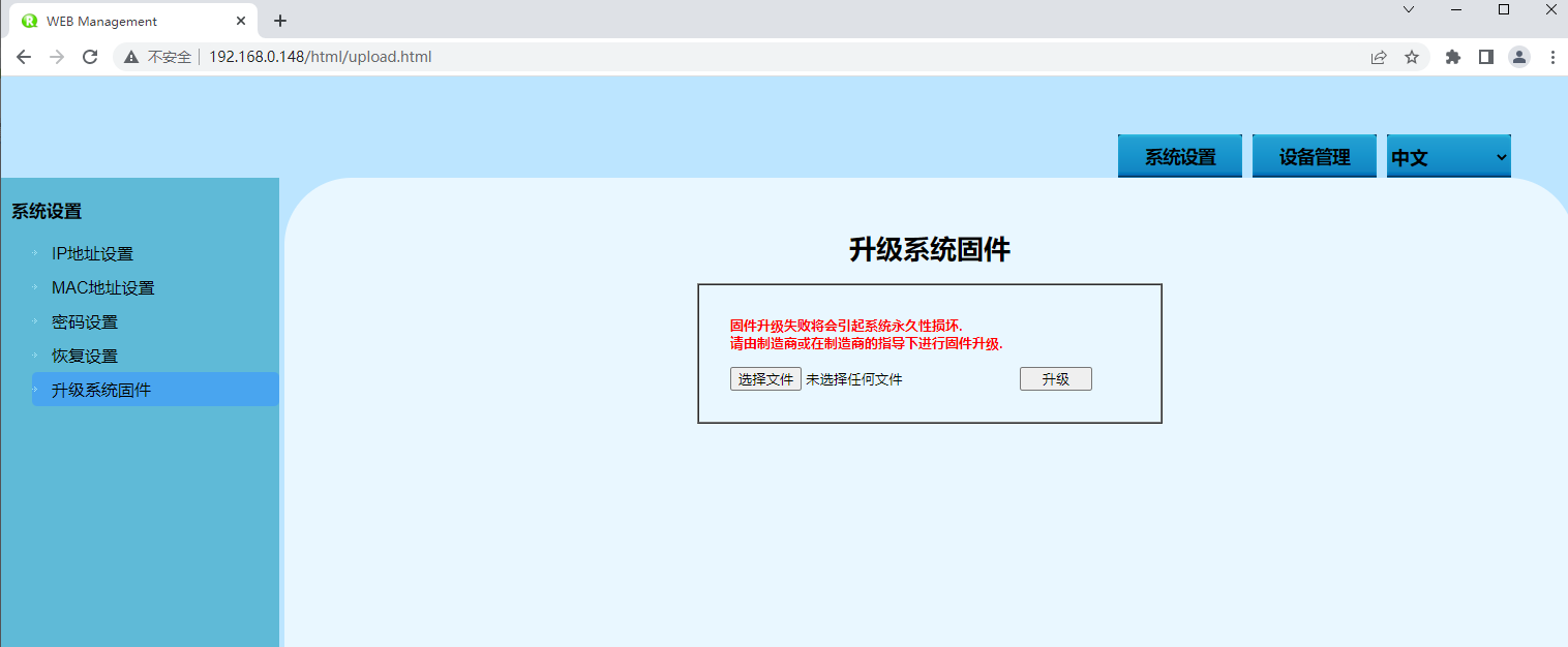 在“固件升級”頁面,可以通過上傳文件對設備程序進行更新與升級。