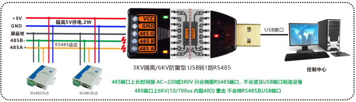 RS485串口帶3KV隔離當長時間接入AC~220V或AC~380V高壓時只燒RS485接口,不燒USB口及相連設備。