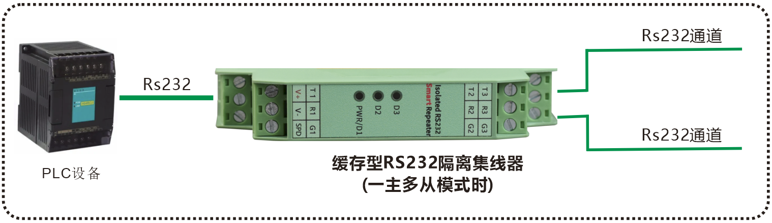 產(chǎn)品功能描述 緩存型 2主一從RS232隔離集線器