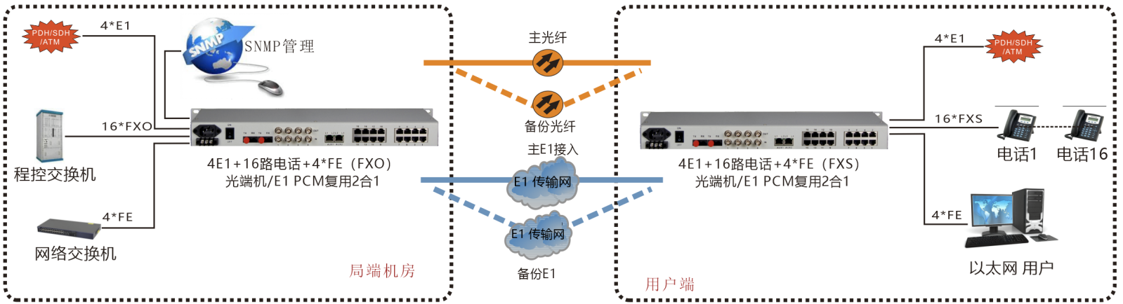 16路電話+4E1+4xFE (光纖1+1備份 E1 1+1 備份) 光端機/E1 PCM復(fù)用