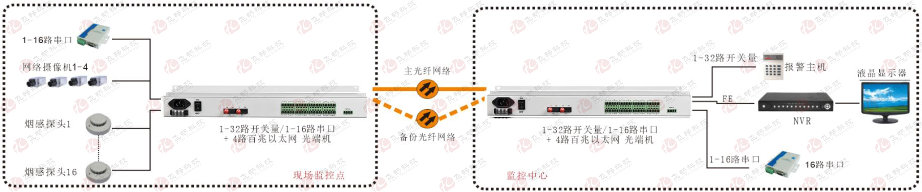 業(yè)務端口描述 2個1*9光纖口,32個開關量/16個串口+4路以太網(wǎng)光端機