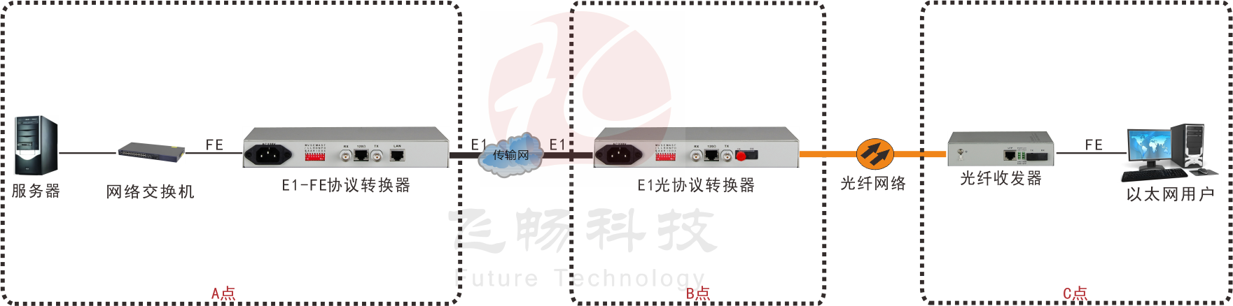 se-T協(xié)議轉(zhuǎn)換器的10/100base-T接口的連接,通過(guò)E1的傳輸與B點(diǎn)的E1傳以太網(wǎng)光口(100baseT-FX)轉(zhuǎn)換器轉(zhuǎn)成光纖后傳到C點(diǎn)的光纖收發(fā)器,與以太網(wǎng)交換機(jī)及用戶(hù)PC機(jī)等設(shè)備實(shí)現(xiàn)3點(diǎn)之間的以太網(wǎng)數(shù)據(jù)通信功能。 設(shè)備可設(shè)為成幀模式,E1傳輸線(xiàn)路帶寬為2.048M;此方案可以從A點(diǎn)網(wǎng)管到B點(diǎn)與C點(diǎn)。